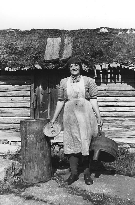 Brödtunna, mjölksil, tunnkar (tratt), en kvinna.