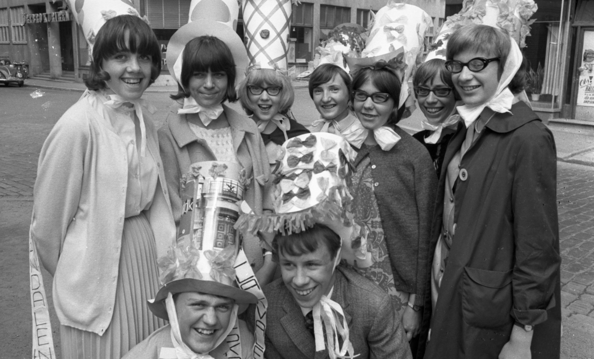 Sju flickor och två pojkar är utklädda i höga hattar med knytband under en skolavslutning. I bakgrunden står det "Örebrokuriren" på en byggnad.