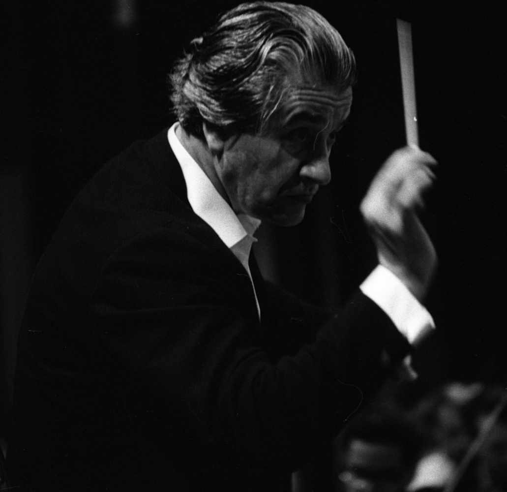 En dirigent klädd i vit skjorta och svart kavaj viftar med taktpinnen framför en orkester.