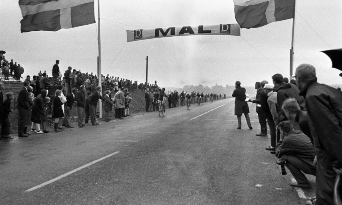 Ett antal cyklister cyklar in i mål under en tävling. Publik står på båda sidor om vägen och tittar på. Två svenska flaggor står uppställda vid var sin sida om vägen. Över vägen hänger en skylt med texten: "Mål."