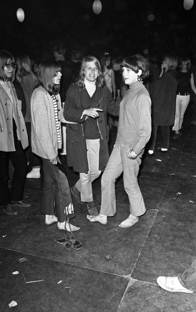 Närbild på tre flickor ur publiken under en musikföreställning klädda i blusar, tröjor och byxor. Flickan i mitten bär kappa. Två av flickorna är barfota. Flickan till höger håller snörena till ett par sandaler i sin högra hand.