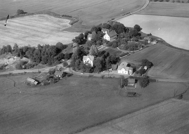 Flygfoto över Götabro, bostadshus och ekonomibyggnader.