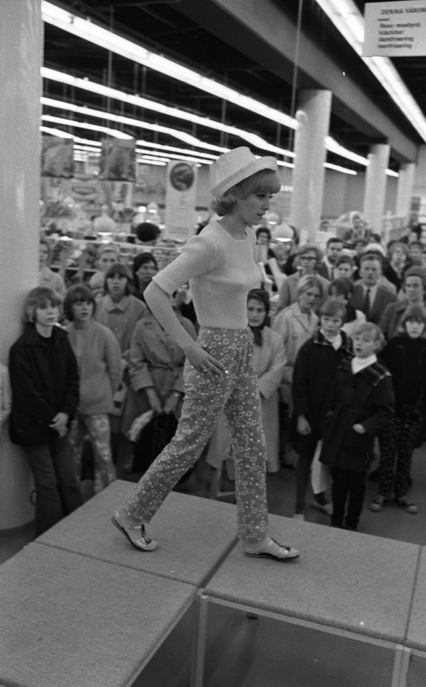 En fotomodell i vit blus, färgglada byxor med bubbelmönster på, vit hatt samt sandaler går på catwalken. Publik står nedanför och tittar på.