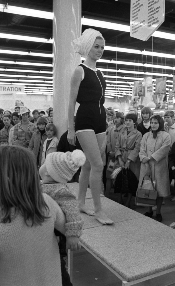 En fotomodell iklädd en genomskinlig svart, ärmlös body med vita kantbårder på samt en virad schal på huvudet går på catwalken. I förgrunden bland publiken står en kvinna med en baby i famnen. I bakgrunden syns mer publik.