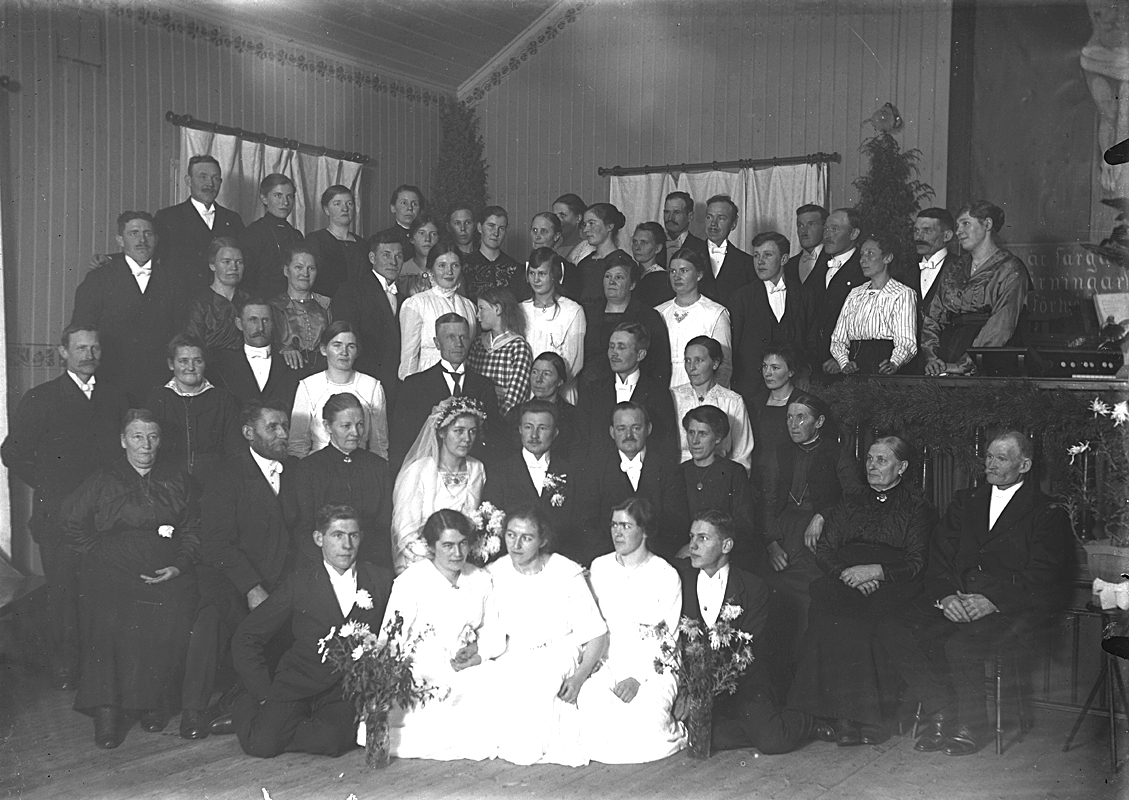 Interiör, bröllop, brudpar och bröllopsgäster.