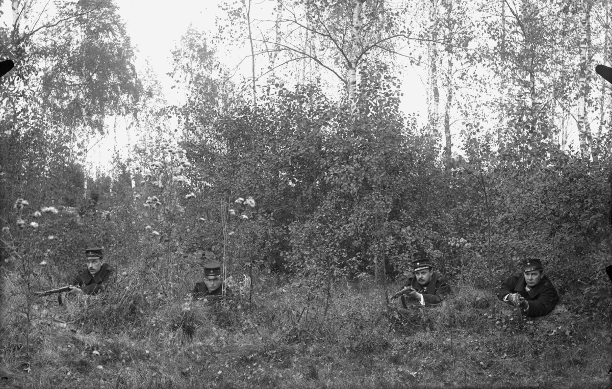 Fyra soldater (fyra män i militäruniform) med vapen.