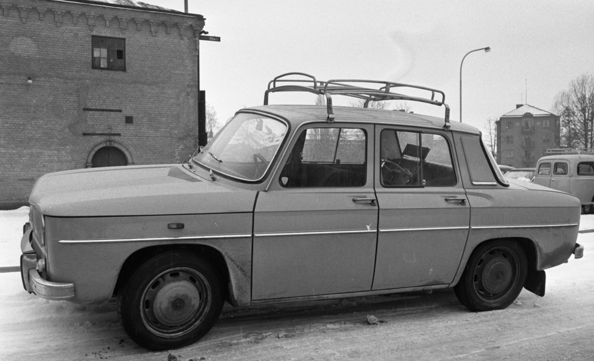 En bil står parkerad. Hus syns i bakgrunden. Det ligger snö på marken.