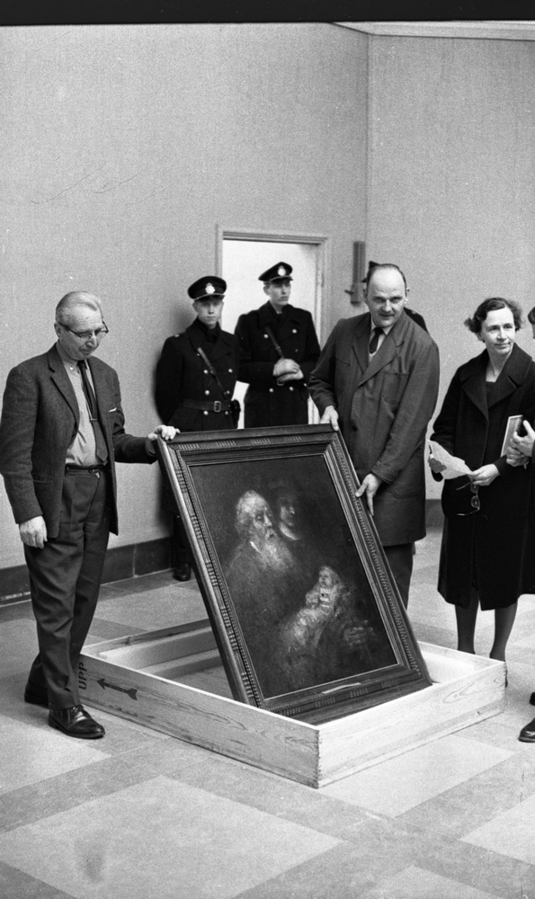 Två herrar håller i en tavla föreställande den gamle Simeon i templet och jesusbarnet. Herrn till höger är klädd i ljus arbetsrock. I bakgrunden står två poliser och tittar på. En kvinna i svart kappa står bredvid den arbetsklädde mannen.