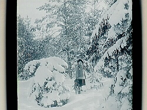 Märta Lindskog med kälke i skogen.
