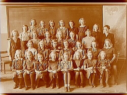 Vasaskolan, klassrumsinteriör, 29 flickor med lärarinna fru Lisa Dahlstedt, klass 6, sal 23.