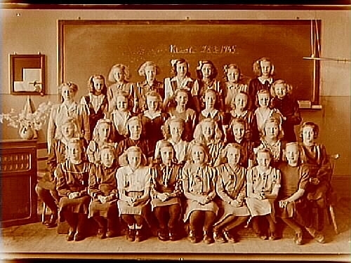 Titel: Vasaskolan, klassrumsinteriör, 30 flickor med lärarinna fröken Margit Svensson, klass 6c, sal 22.