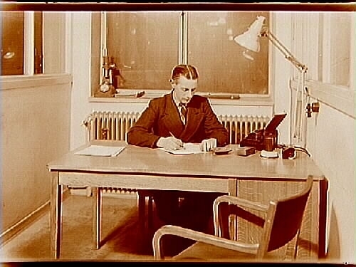 AB Motorrenovering, interiör från verkmästarkontoret, en man, Herr Lång.