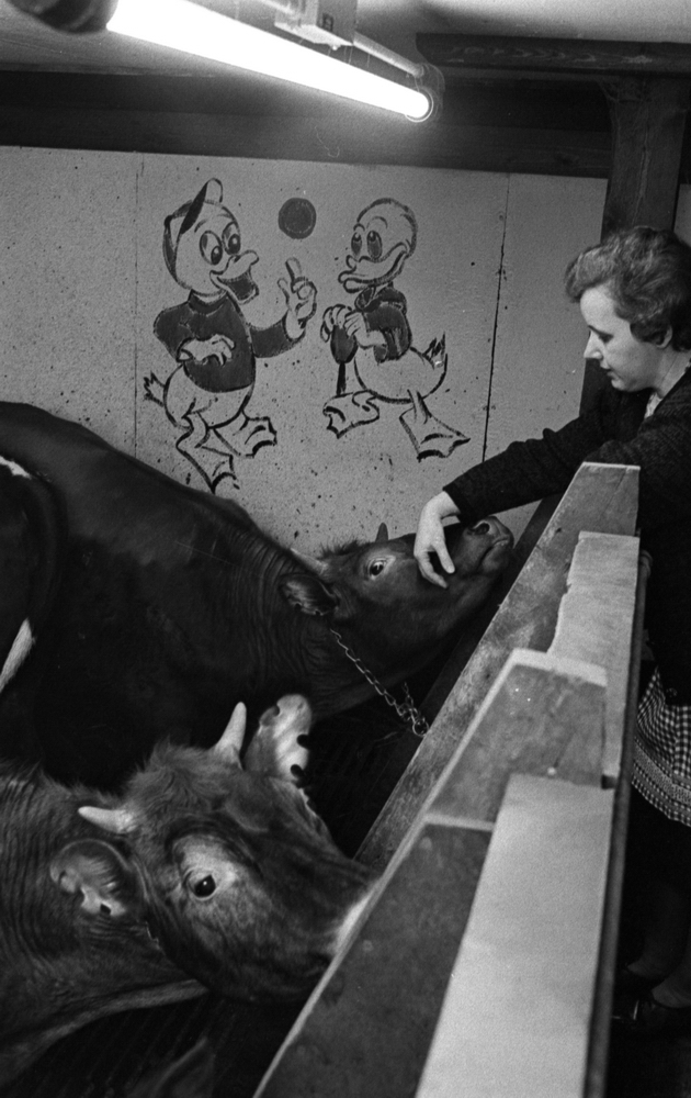 Inne i en ladugård står två kor i ett bås. Framför den ena kon står en kvinna klädd i ljus blus, ljusrutigt förkläde och mörk tröja. Hon är i färd med att klappa kon på mulen. Vid sidan om korna på väggen har någon målat ett konstverk. Den föreställer Kalle Anka och en av knattarna.