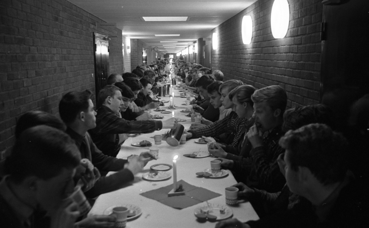 Närbild på ett antal pojkar i tonåren som sitter närmast vid ett dukat långbord och dricker kaffe och äter lussbullar. Borden har tända ljus i stakar. I bakgrunden syns flera tonåringar.