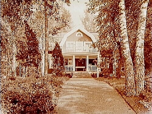 Envånings sommarvilla med inredd vind, frontespis, balkong och veranda, brutet tak.