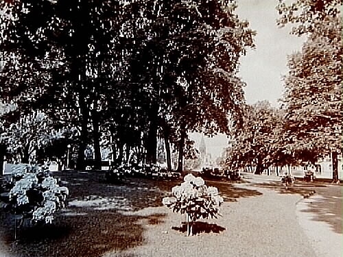 Oskarsparken, parkmotiv med Nikolaikyrkan i bakgrunden.