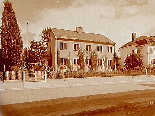 Tvåvånings villa med burspråk, förstebro och två balkonger.