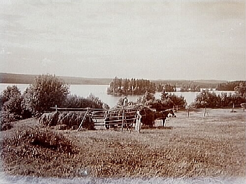 Siggeboda gård, skördebild, höbärgning, häst spänd för hölass, två kvinnor.