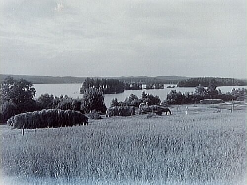 Siggeboda gård, skördebild, höbärgning, häst spänd för hölass, två personer.
