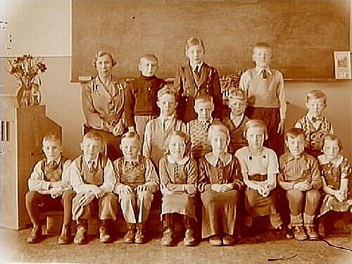 Norra skolan, klassrumsinteriör, 15 skolbarn med lärarinna fröken Ingeborg Sandberg, sal 8.