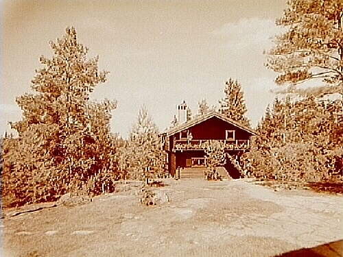 Envånings knuttimrad sommarvilla med inredd vind, 3 personer framför villan.