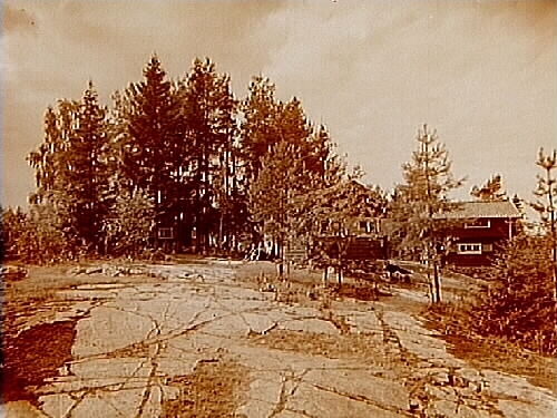 Envånings knuttimrad sommarvilla med inredd vind, 3 personer framför villan.