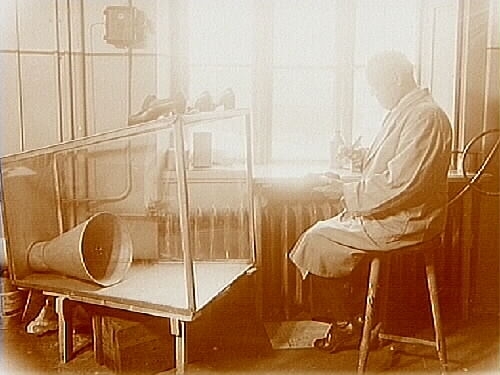 Interiör av skofabrik, Berggren sprutar polish på skor.