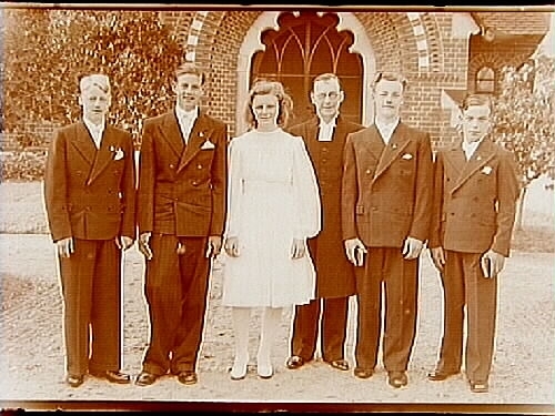 Konfirmander, en flicka, 4 pojkar och kyrkoherde Eneström.