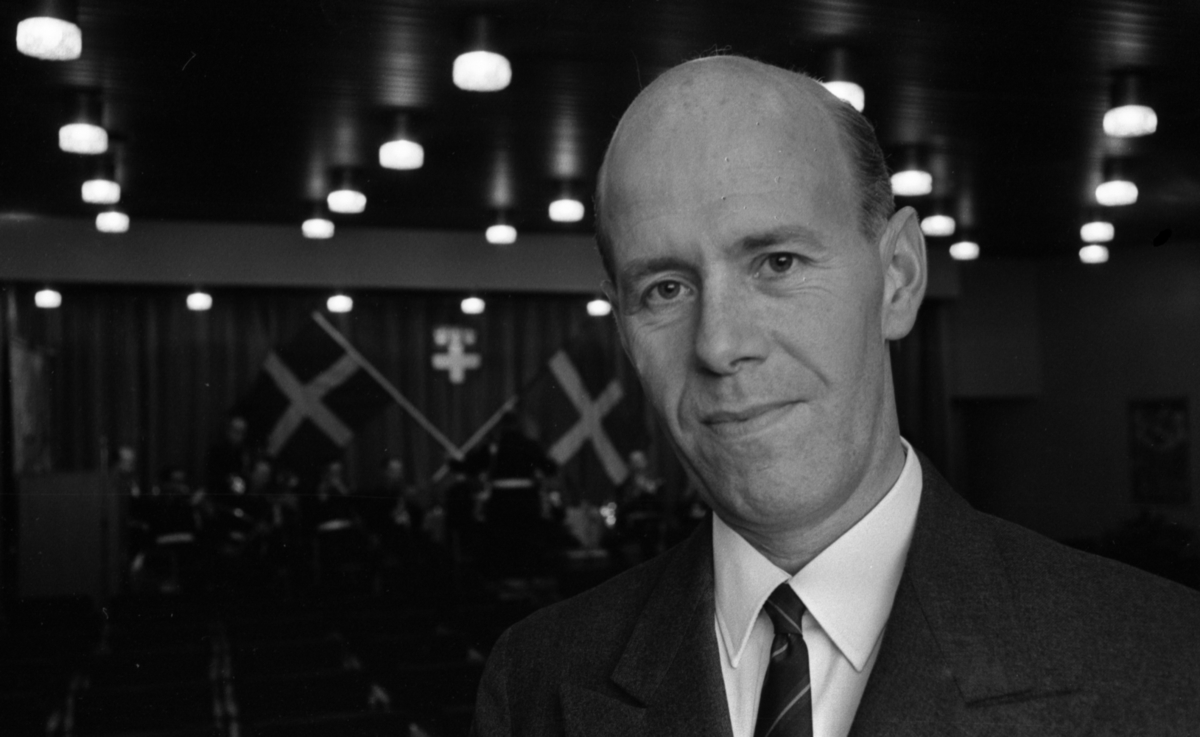 Närbild på en major klädd i grå kostym, vit skjorta och mörkrandig slips.