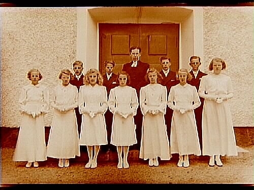 Konfirmander, 7 flickor, 4 pojkar och pastor Gottberg framför Almby kyrkas port.