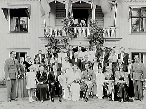 Bröllop, brudpar och bröllopsgäster framför huset.