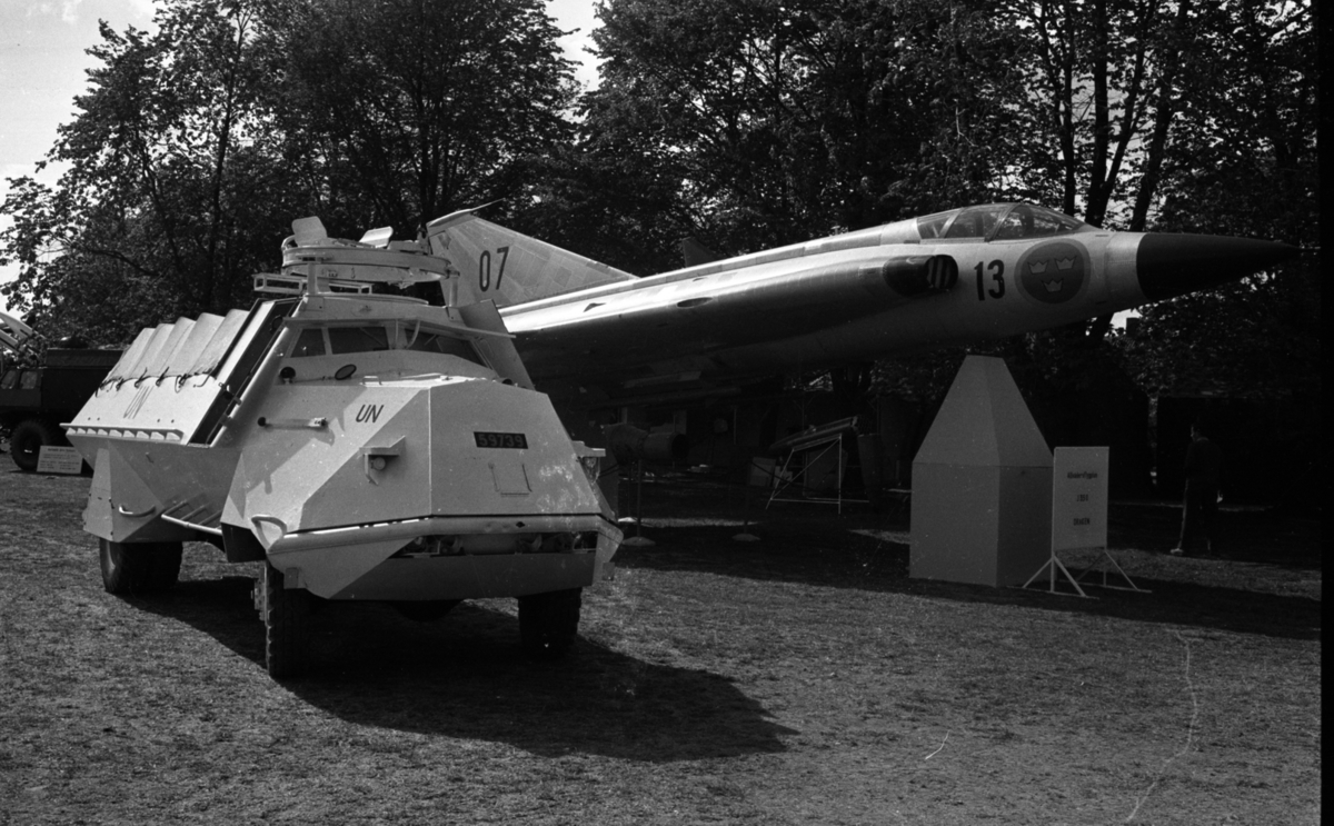 Flygplan. Utställning. Jaktflygplan J35D Draken. I förgrunden en FN- pansarvagn.