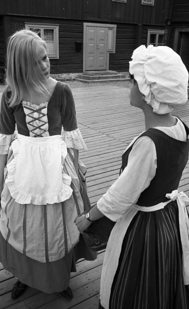 Två skådespelare i aktion. Klädda i 1700-talskläder. Kvinnan till vänster är Birgitta Götestam.