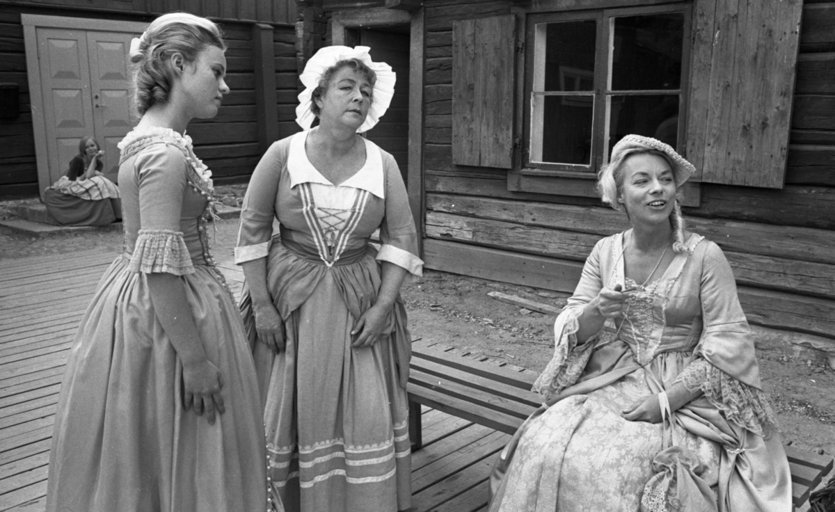 Tre skådespelare i aktion. I bakgrunden sitter Birgitta Götestam. Klädda i 1700-talskläder.