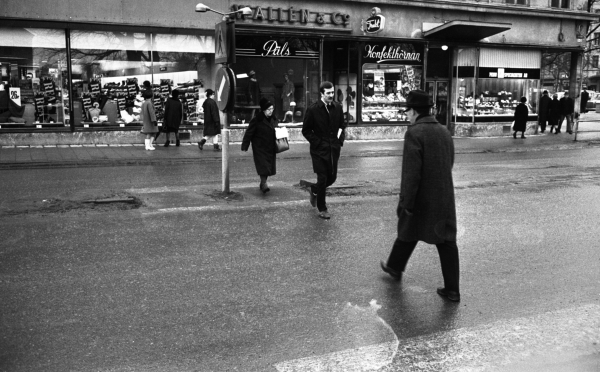 Två män iklädd i rock, och en kvinna med kappa går vid övergångsstället på Storgatan. På bilden ser man skyltfönstret på varuhuset Epa.