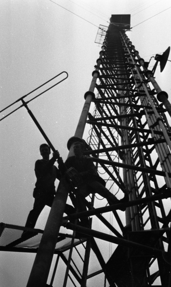 En man i arbetskläder står i Kilsbergsmasten och jobbar.