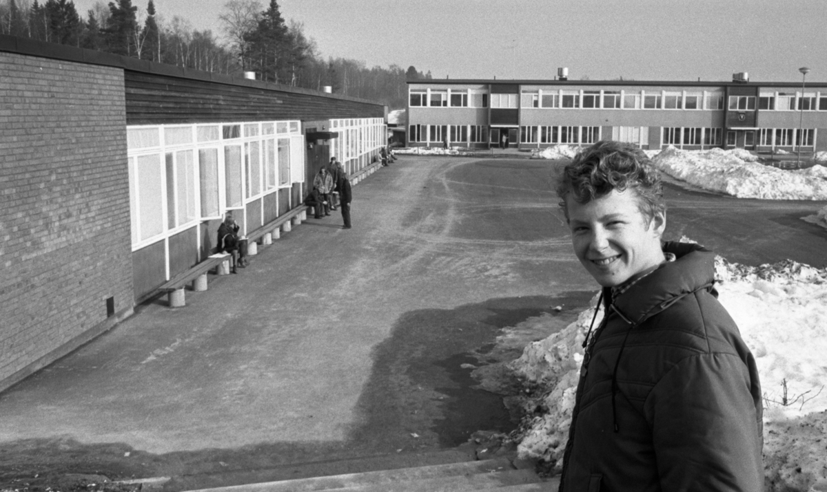 En tonårspojke står i förgunden klädd i en ljus jacka och en rutig skjorta framför en skola i Pålsboda. Flera elever syns i bakgrunden.