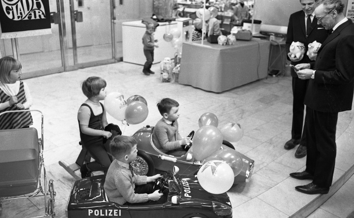 Krämaren firar 5 år som butik. Två män i kostym står framför två pojkar sittande i trampbilar med ballonger.