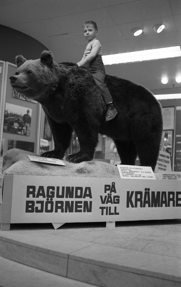 Ragunda Björnen på väg till Krämaren. En pojke sitter på den uppstoppade björnen.