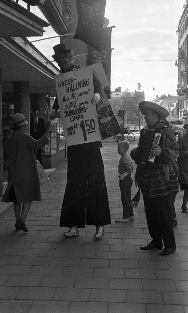 Titel: Jättelång clown 15 maj 1965 Clown och dragspelare på gatan under Örebro Jubileum 700.