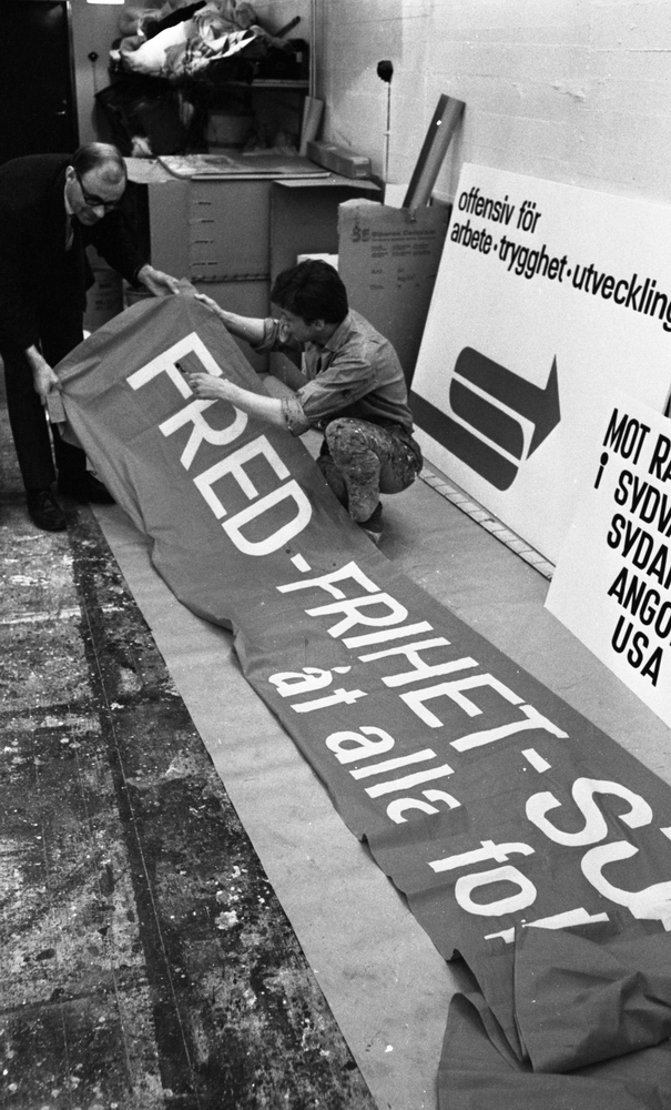 Två män håller i en banderoll och förbereder inför 1 maj. Bakom dem står det några plakat mot väggen.
