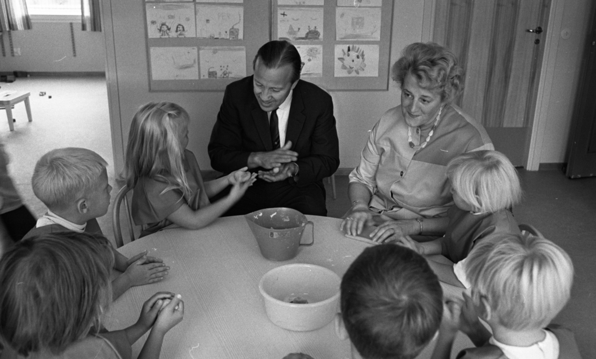 Vid ett bord sitter en förskollärare och en man i svart kostym med barnen och leker med trolldeg. Bakom dem ser man teckningar på väggen.