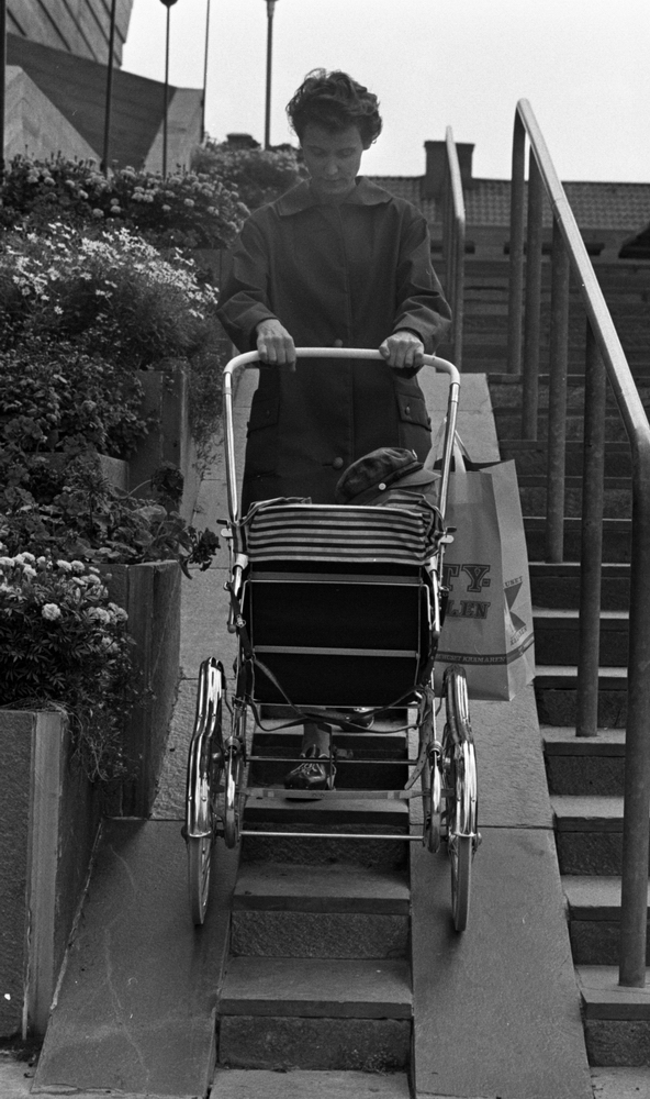 En kvinna går nedför i trappan med en barnvagn från varuhuset Krämaren.