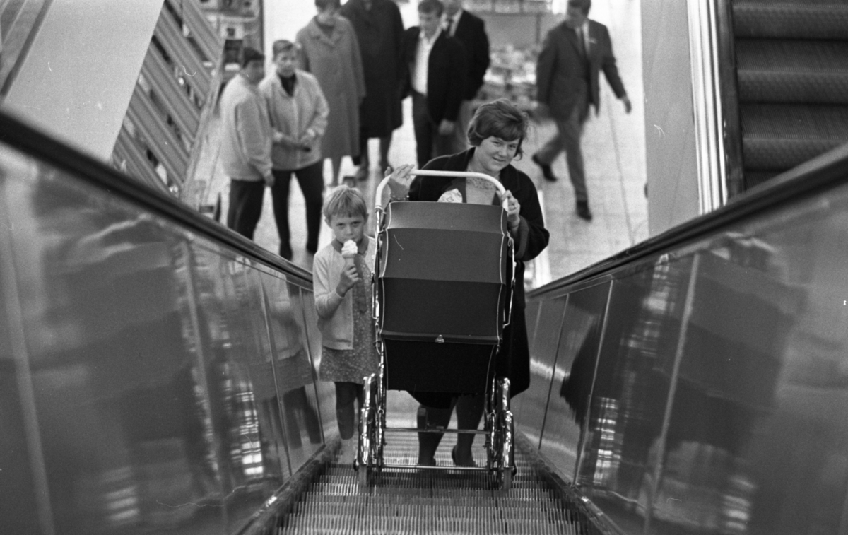 På varuhuset Krämaren åker en kvinna med barnvagn och