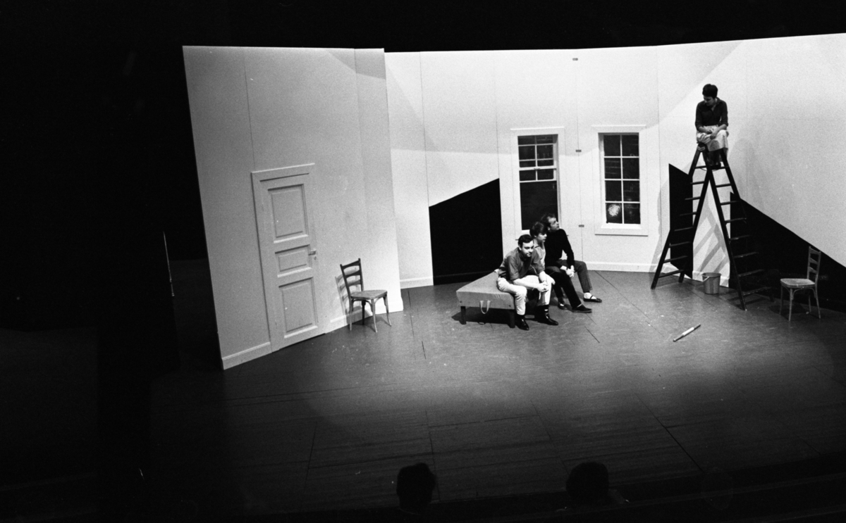 Tre män sitter på en säng, och en kvinna sitter på en stege på scenen till teatern.
