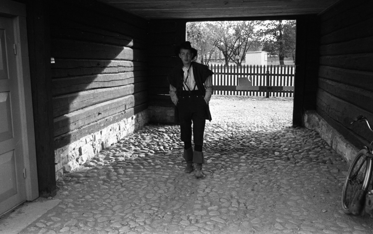 Skådespelare på ingång. Klädd i 1700-talskläder.