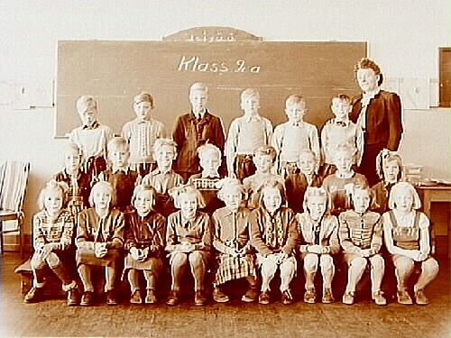 Titel: Olaus Petriskolan, klassrumsinteriör, 23 skolbarn med lärarinna fru Gerda Zackrisson, klass 2a, sal 7.