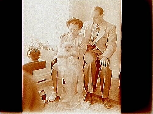 Familjegrupp, två vuxna och en baby.