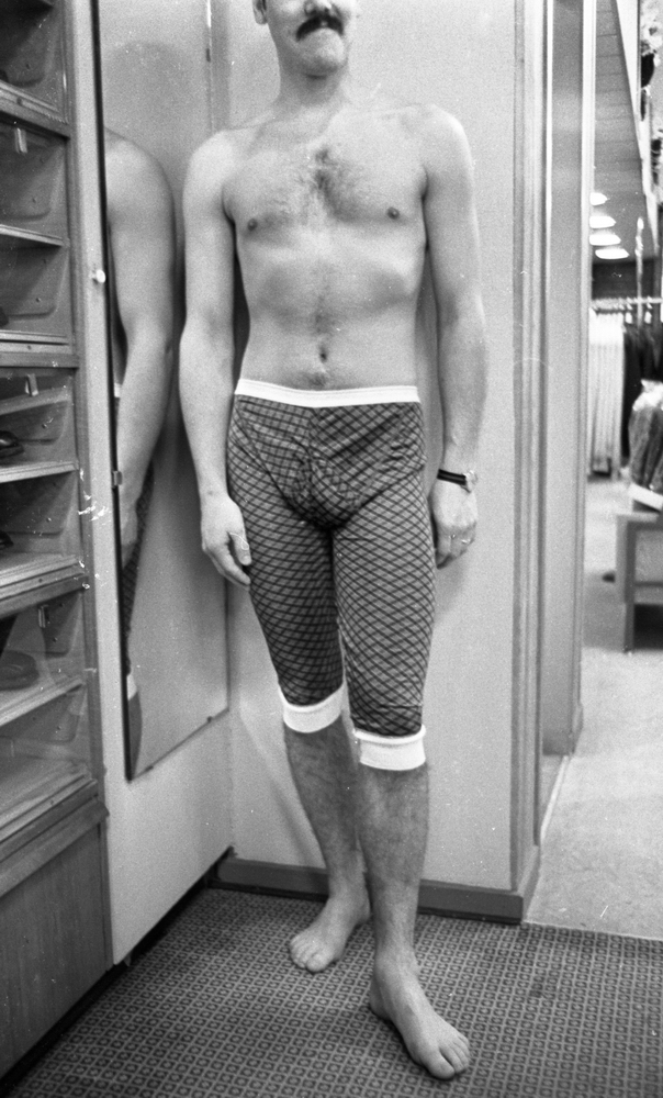 En man visar sig i knälånga kalsonger i en klädaffär.