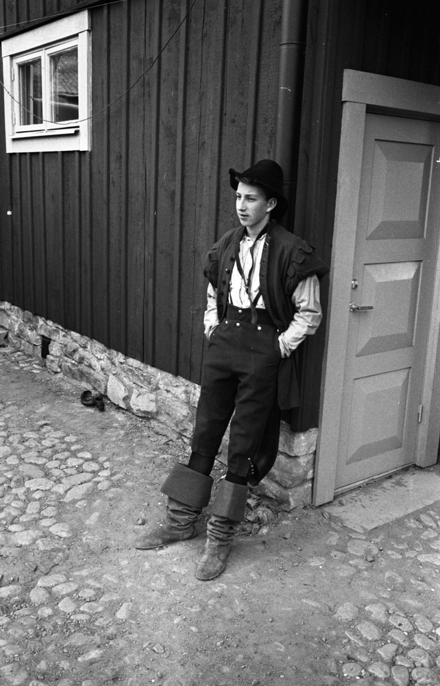Skådespelare i 1700-talskläder. Ung pojke står lutad mot vägg.